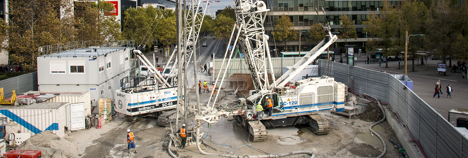 Trevi France is performing diaphragm walls in the job site, by means of hydromills and grabs. The diaphragms made with the Soilmec Tiger SC-90 hydromill have a thickness of 1200 mm and a depth of 53 m, while those made with the Soilmec SC-90 crane have a thickness of 800 mm and a depth of 23 m.