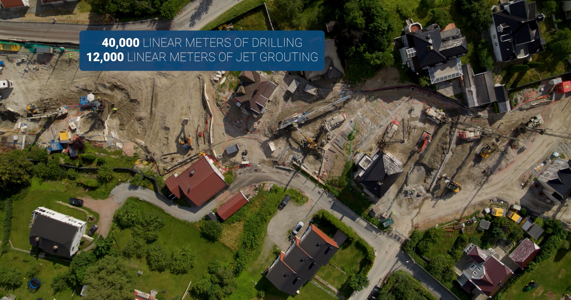 A few numbers can illustrate the complexity of the work implemented by Trevi Spa for the Drammen-Kobbervikdalen high-speed line project: to date, a total of over 40,000 linear meters of drilling and over 12,000 linear meters of jet grouting have been carried out with different diameters: from 1,000 mm for the monofluid columns, to 2,500 mm for the bifluid columns executed in the “full face” zone.