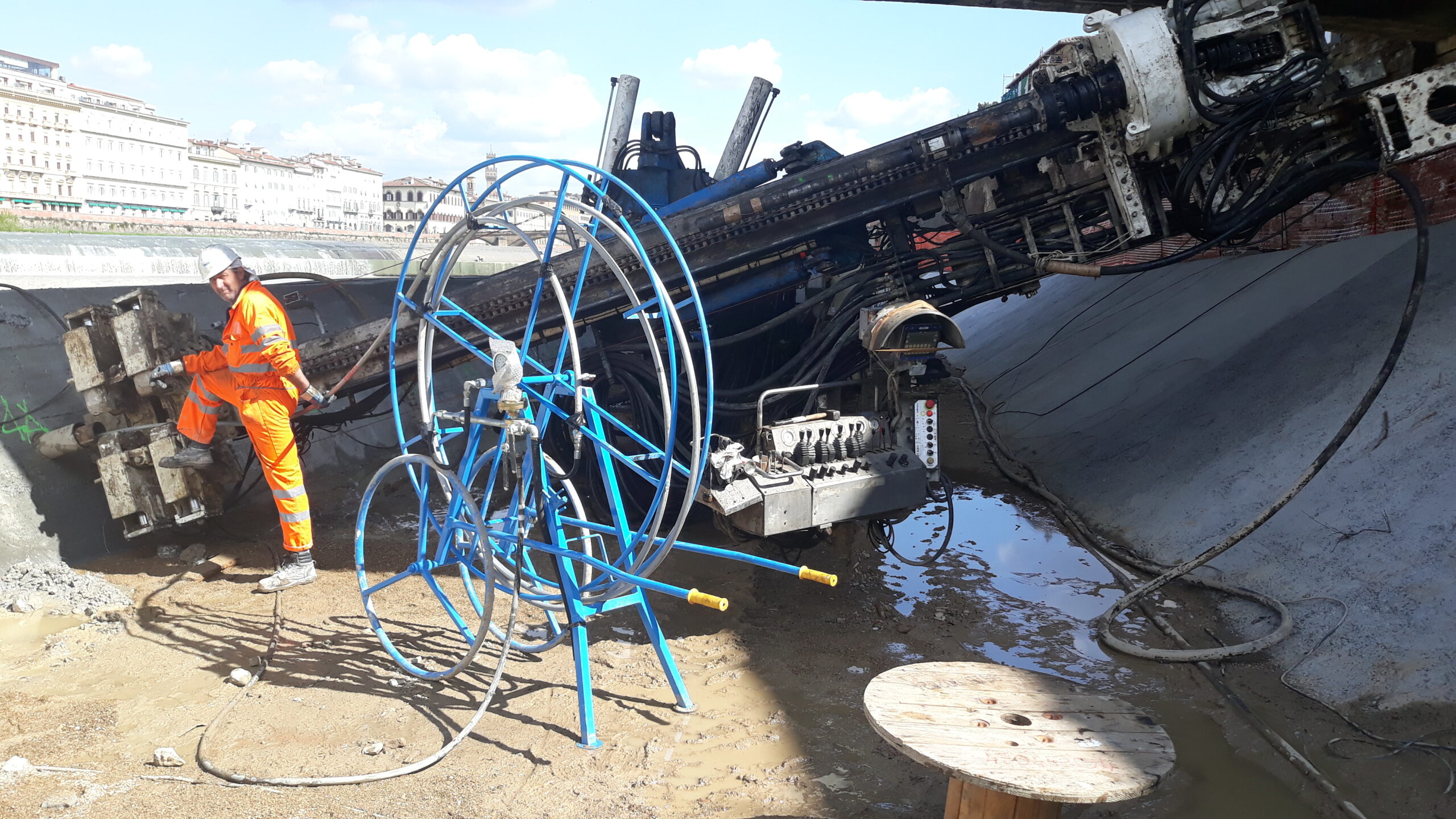 Trevi Spa, che proprio in un recente passato era intervenuta con pieno successo al ripristino del Lungarno Torrigiani, è stata “richiamata” a Firenze, per occuparsi, all’interno di un consorzio d’imprese, della messa in sicurezza delle fondazioni al di sotto della pila sinistra del Ponte Vespucci. Un intervento di non poco conto che ha richiesto l’esecuzione di iniezioni attraverso canne a manchettes (TAM), installate mediante perforazioni direzionate di piccolo diametro.