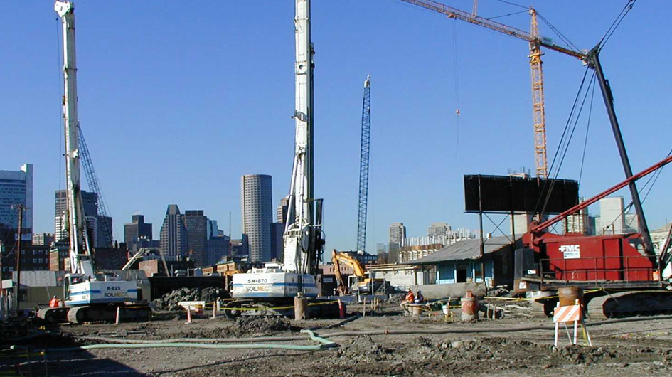 The Boston Convention Center Hotel occupies a 4.2 acre site adjacent to the Boston Convention Center. The building is a steel-framed high-rise structure occupying 27,500 sq.ft. and is 18 stories high. There is a podium structure containing one below grade level and three above grade levels housing parking space, a ballroom, banquet rooms and restaurants. The foundation is supported on a combination of driven pipe piles and drilled shafts. TREVIICOS installed 6,600 VLF of reinforced concrete drilled shafts.