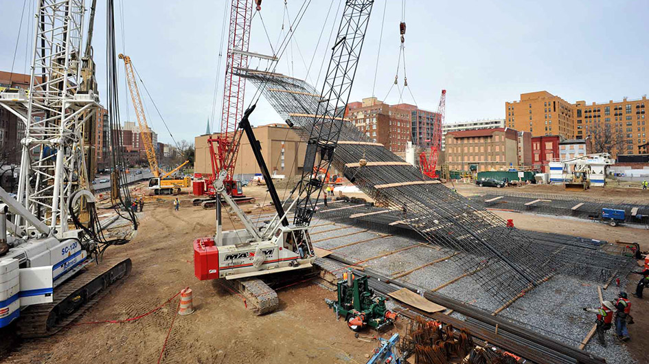 The foundation work was awarded to a TREVIICOS lead joint venture, DC Slurry Partners. It consisted of 95 slurry wall panels with a thickness of 36 and 42 inches and depths of up to 123’ deep, 142 drilled shafts 5, 6 & 7 ft. in diameter, with depths exceeding 150’.