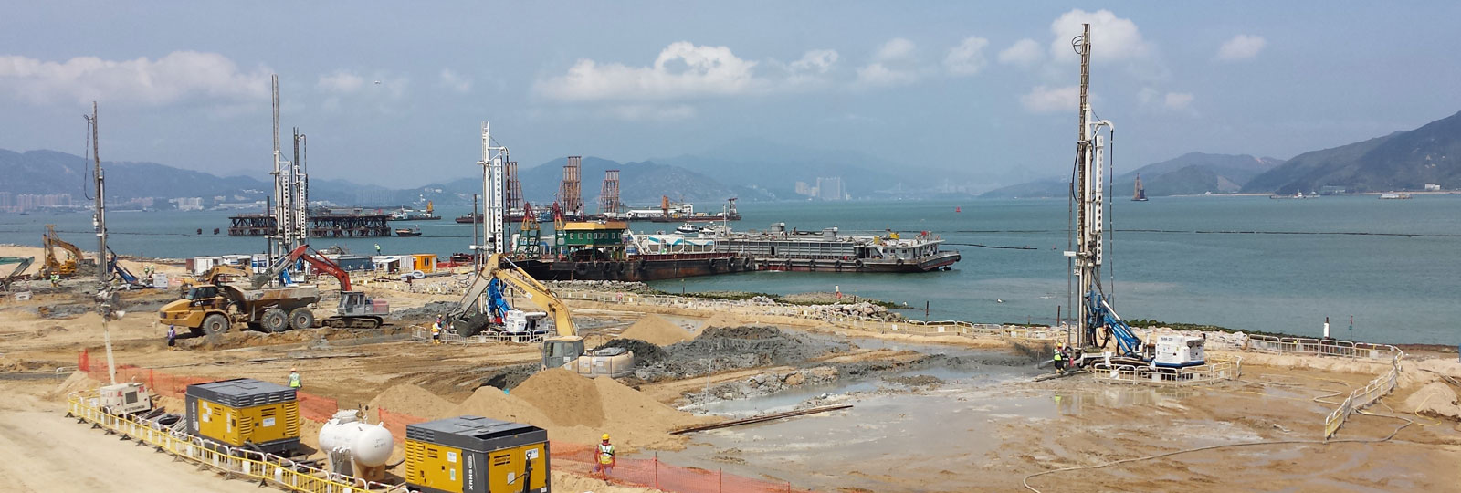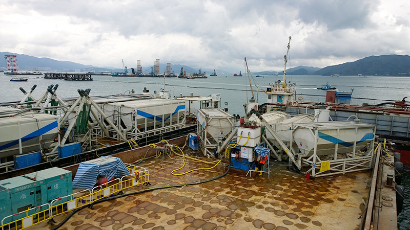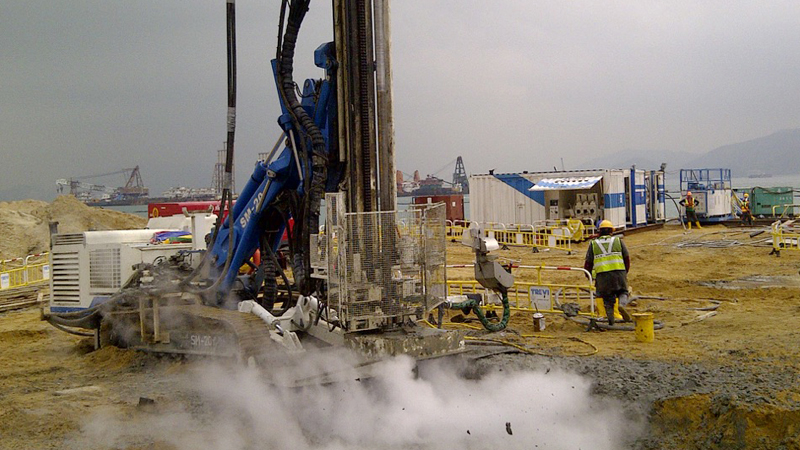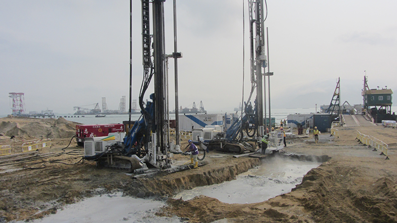 The artificial island’s geological conditions challenged the stabilization efforts. The top ground layer of about 8.5 meters of sand fill is followed by approximately 18.5 meters of very soft marine mud. Trevi Hong Kong needed to penetrate through the soft sand fill and marine mud into at least 1 meter of the alluvium material that rests below.