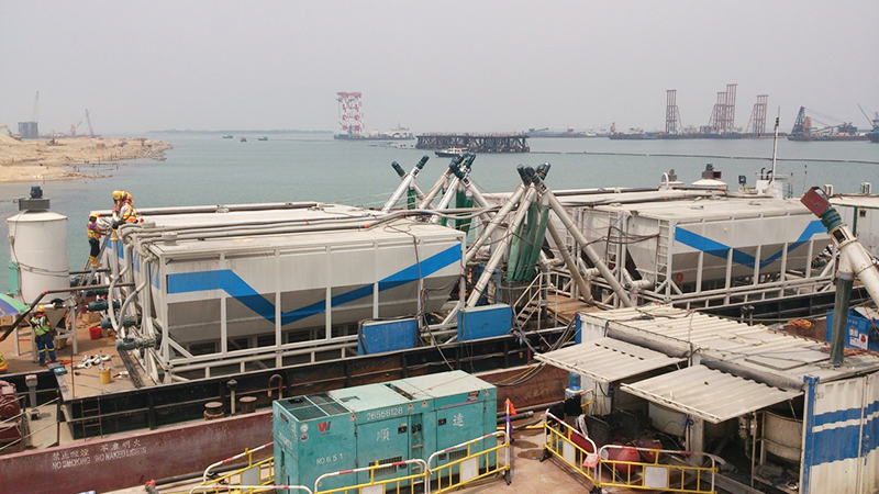 The artificial island’s sea wall was built using a new, non-dredge approach. Large 30-meter-diameter steel caissons were dropped into the sea a few meters apart and joined by a flexible steel wall. As the mud was dug out from the middle, each 450-ton caisson drove itself down towards the hard strata. This new reclamation technique was used instead of the conventional approach of dredging out the soft mud down to the bedrock and replacing it with marine sand. Additional ground strengthening measures were also needed to help stabilize the island’s soft marine mud before constructing boundary crossing facilities and tunnel landing points. Trevi Hong Kong joined these stabilization efforts by installing jet grout columns in a key area of the island.