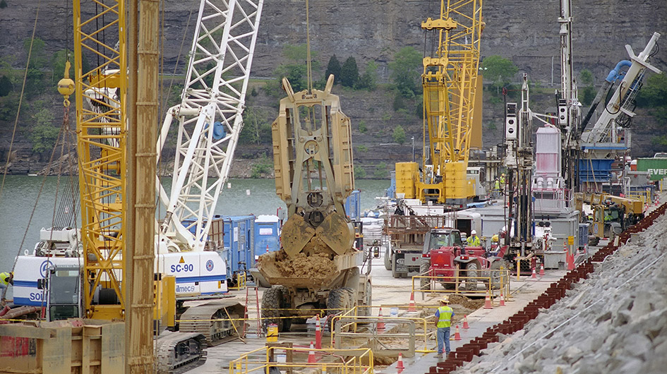 This major rehabilitation program was awarded in 2008 to the TREVIICOS led joint venture, TREVIICOS-Soletanche, JV, for the construction of a 980,000 sqft concrete barrier. This 2-ft. wide concrete barrier wall has been built to depths exceeding 275 ft. under quality control measures that exceed by far the industry standards. Ground-breaking methods were developed for construction and quality control. Specialized equipment designed and built for this project was used to excavate through the embankment and into the rock foundation. Dam safety and risks associated with work inside an active high head dam were at the forefront of all decision-making.