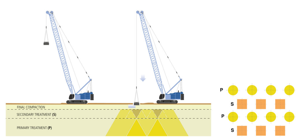 The method involves dropping heavy steel pounders repeatedly on the ground at regularly spaced intervals. The weight and height of pounding depends on the degree of compaction desired. The usual range of pounder weight is between 12 Ton to 25 Ton and the drop height can be up to 25m.