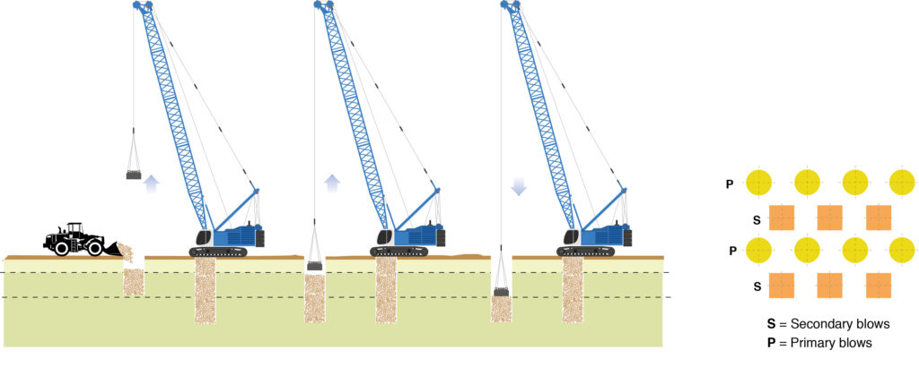 This method combines the advantages from both dynamic compaction and stone columns techniques by creating large sized granular columns with high stiffness and internal shear resistance and overall improvement of mechanical characteristics of the intermediate soil.