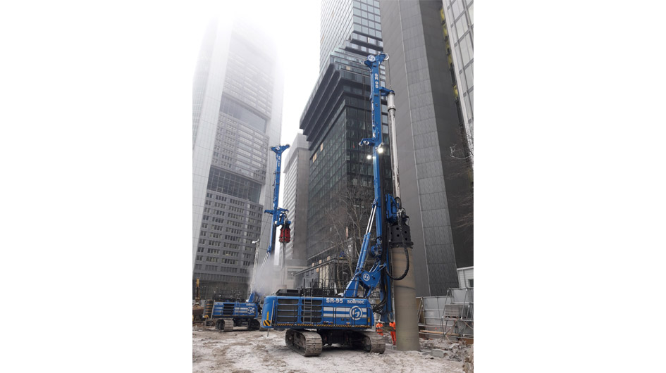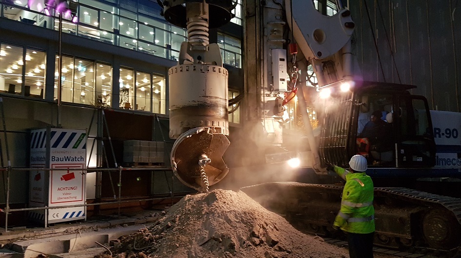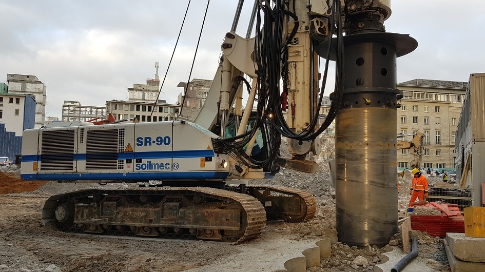 Despite performing careful demolition works, the walls and floor slabs had to remain underground, to avoid affecting adjacent buildings. These reinforced concrete structures must be removed in order to make room for the construction of diaphragm walls. For this purpose, three large drilling rigs are employed (Soilmec SR-90, SR-95 and SR-125), which drill the underground elements and take them out.
