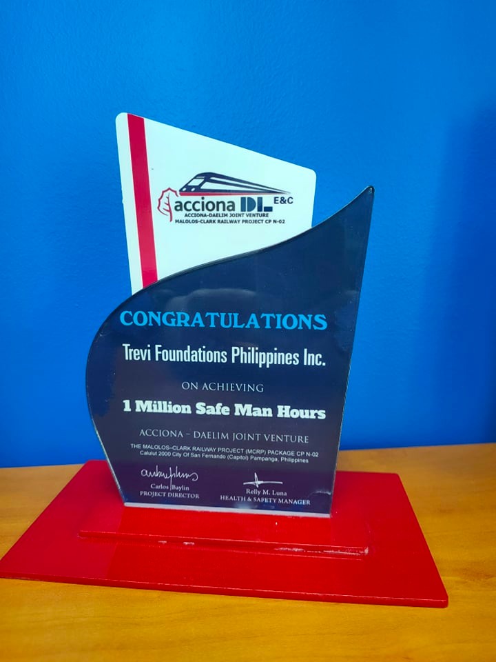 Trevi Foundations Philippines Inc., in the context of its works for NSCR-EX Project, has been awarded for its contribution on achieving 1.000.000 Safe Manhours on the Malolos-Clark Railway Project CP N-02 from nov 2020 to nov 2021.