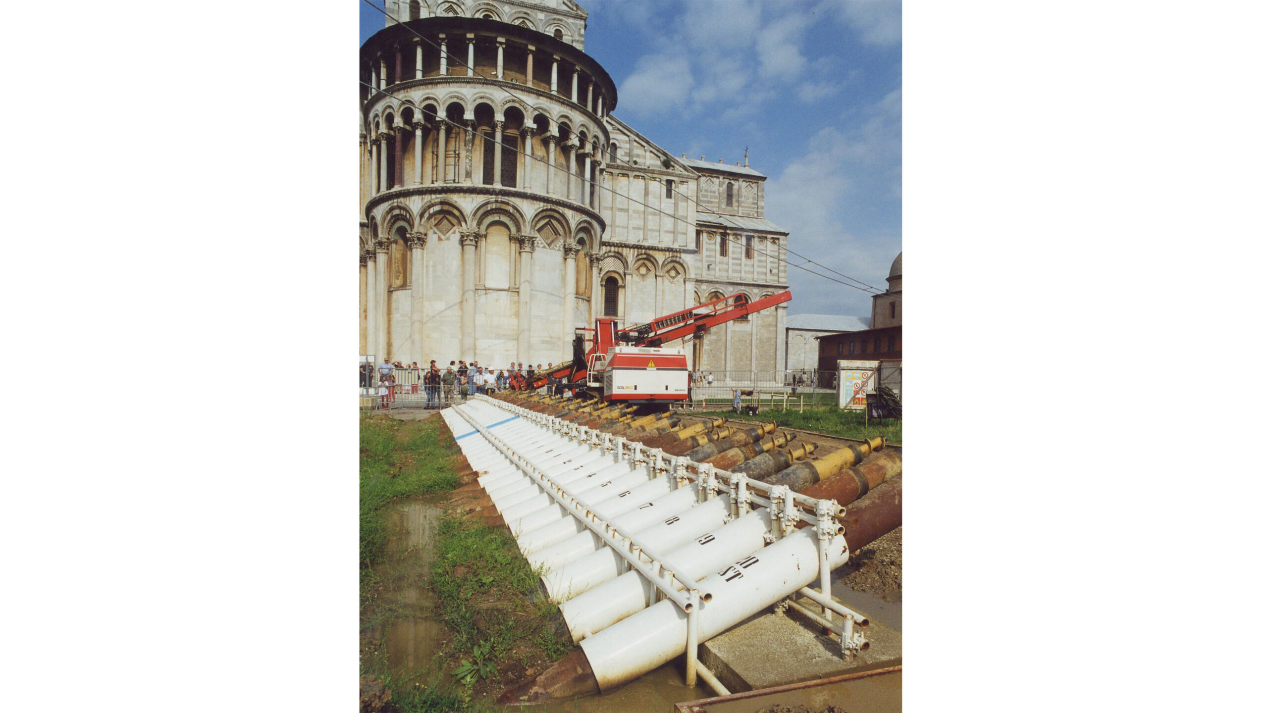 Menos conocida, pero ciertamente no menos rica e interesante, ni menos importante fue la actividad de planificación ejecutiva y realización material de las intervenciones concebidas por el Comité, realizadas con compromiso, pasión y gran habilidad por parte del Consorcio de la Torre de Pisa, constituido por las Compañías. Trevi, Rodio, Italsonda, Ismes y Bonifica.