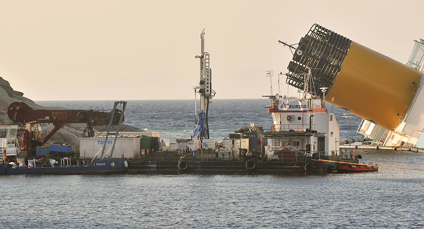 TREVI, impresa specializzata in Ingegneria Geotecnica e fondazioni speciali, ha realizzato (agosto 2012 – settembre 2013) le opere di fondazione delle strutture metalliche subacquee (anchor blocks) necessarie alla messa in sicurezza del relitto (hold back system) ed al successivo montaggio delle torri di ritenuta utilizzate per l’operazione di rotazione (parbuckling).
