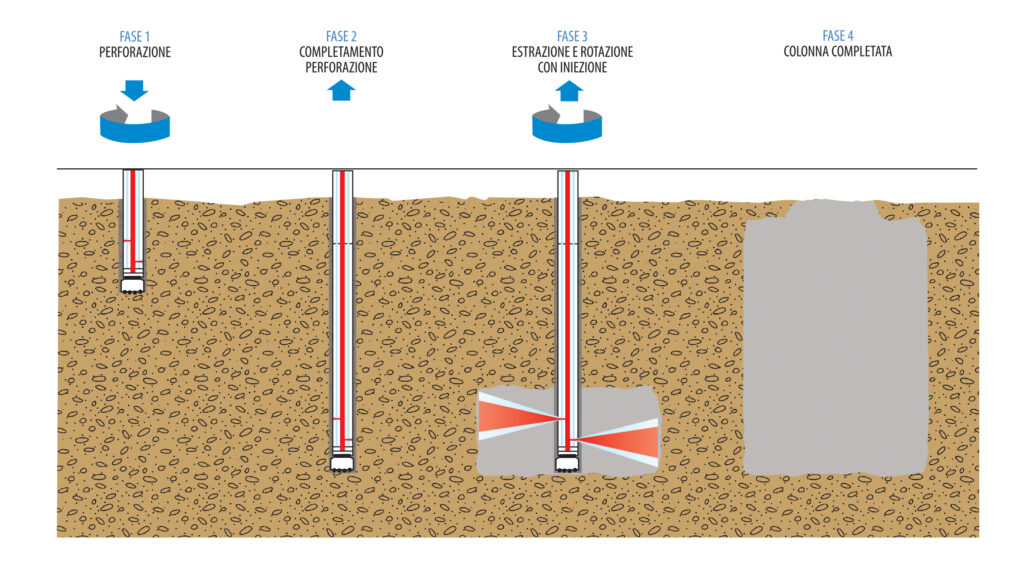 Tutti le tecniche Jet Grouting prevedono una prima fase di perforazione seguita da una fase di risalita e rotazione a valori predeterminati con simultanea iniezione ad alta pressione dei fluidi utilizzati.